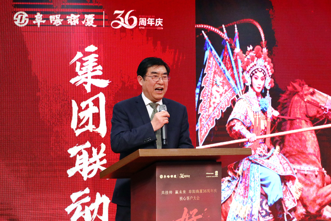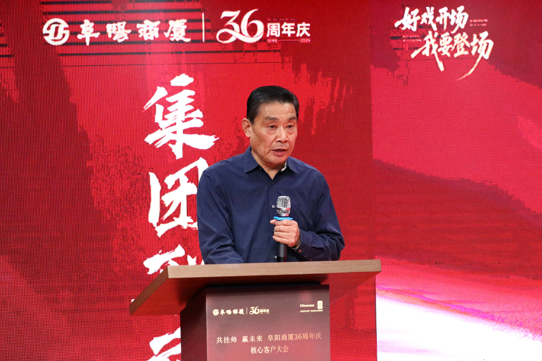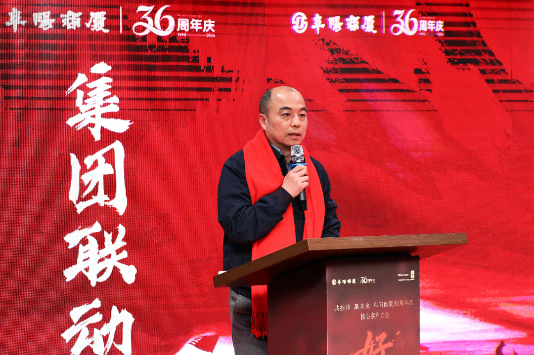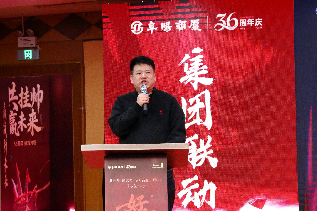 大会高潮环节,阜阳商厦股份有限公司董事长、总经理张志锋发表了振奋人心的讲话。他以“昨天、今天、明天”为脉络,深情回顾了阜阳商厦36年来扎根阜阳、服务民生的奋斗历程,同时,他立足当下,分析了当前商业市场的发展趋势与商厦面临的机遇挑战,并对未来的发展蓝图进行了擘画,鼓励全体员工凝心聚力、奋勇争先,以更饱满的热情、更务实的作风投入到周年庆活动中。